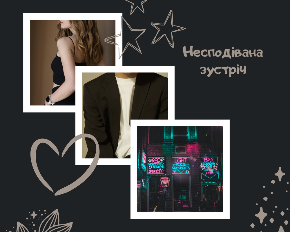 "Неочікувано чоловік повернув голову до дівчат та спіймав на собі погляд Асі. Губи його розтягнулися в задоволеній посмішці й він встав зі свого місця, аби вже через кілька секунд стати перед дівчиною, обпершись ліктем на стійку.