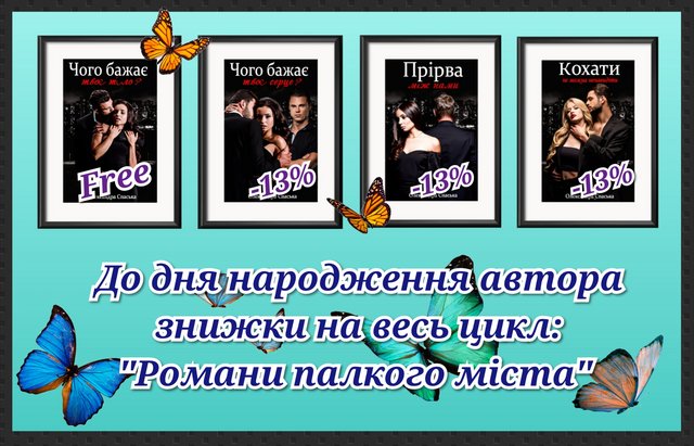 На день народження принято робити подарунки, тож користуючись моментом, дарую сьогодні читачам знижку 13% на всі книги в циклі: "Романи палкого міста"(перша книга - безкоштовна). Жанр: СЛР, еротика (+18). Не забудьте завітати в гості та скористатися можливісю поринути у романтичні історії, наповнені емоціями та пристрастю!