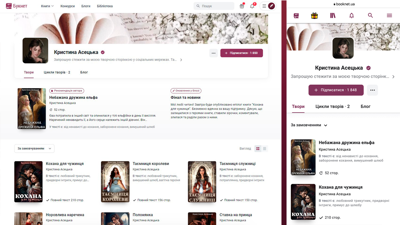Сторінка автора на Букнет відтепер не лише виглядає більш сучасно. Вона дозволяє зручно сортувати книги, відображає книги не лише стрічкою, а й плиткою (якщо на сторінці автора розміщено багато творів), дозволяє отримувати рекомендації від автора щодо найактуальнішого твору та бачити останні новини, що розміщені автором блозі.