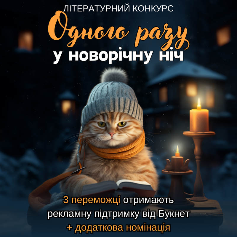 На Букнет розпочато конкурс серед добрих та легких оповідань на новорічну тематику. Обмеження у жанрах - мінімальні. Очікуємо твори таких напрямів: Молодіжна проза, Короткий любовний роман, Міське фентезі, Детектив, Гумор, Містика