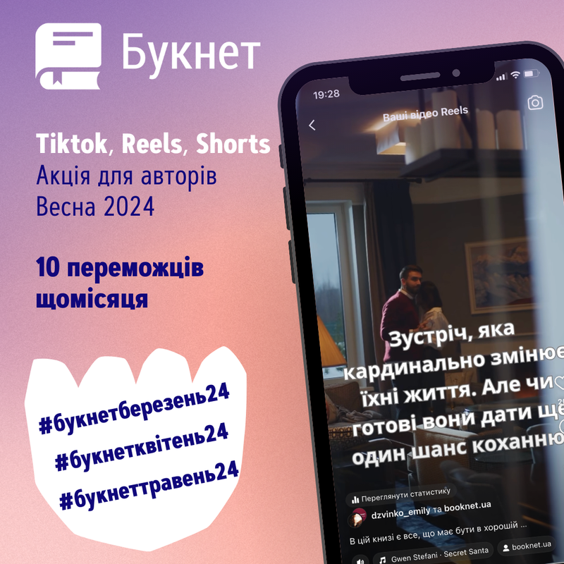 Публікуйте промовідео про власні твори у TikTok, Instagram Reels, Facebook Reels, YouTube Shorts - вигравайте рекламу на Букнет! Цієї весни щомісяця 10 переможців акції будуть отримувати по 500 переходів за банером на будь-який свій твір на сайті.