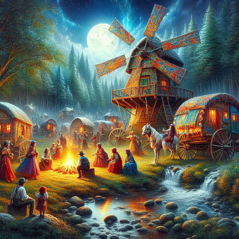 УвійтиОй, як яскраво, клас!) Табір ромів і дійсно, навіть за думкою ШІ, що театр)) А дівчатка файні й ловкі які!)) Любо й мило гляну:)