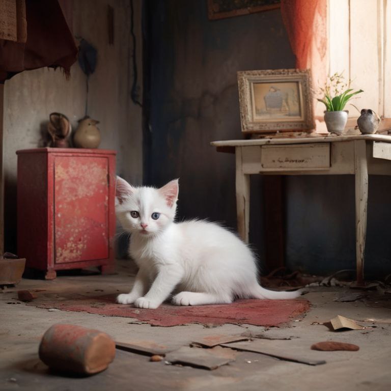 Кошеня дивилося на мене з цікавістю, але трохи побоювалося. Воно було абсолютно білим, а його очі виявилися різного кольору: один жовто-зелений, а другий блакитний. Це ж треба, котик із гетерохромією! Вперше бачила такого наживо, а не на фото.
