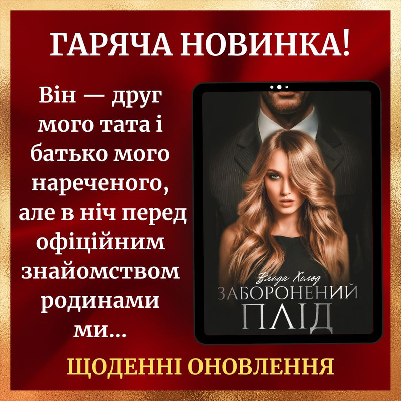 Друзі, хочу запросити вас до нової історії від Влади Холод "Заборонений плід"! Це книга про дівчину, батько якої хоче, щоб вона зустрічалася з сином його друга. Та несподівано між Адель та батьком її хлопця спалахують почуття... Чи вдасться їх стримати? Про це дізнаємося, прочитавши цю історію!