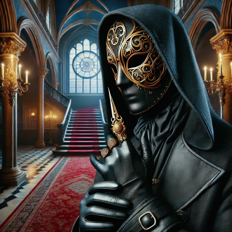 Чорна металева маска закриває все обличчя, навіть у вирізах для очей вбачається лише темний морок, невідомі золоті візерунки таємничо виблискують на аксесуарі, простягаючись від лоба до щік. Довгий сюртук з капюшоном та шкіряні рукавиці приховують кожен сантиметр тіла, Навіть шарф-крават пов’язаний таким чином, що не видно бодай тонкої смужки шиї. Несподівано, на моїх очах третій перстень вказівного пальця лівої руки, повільно виріс у маленький кинджал.
