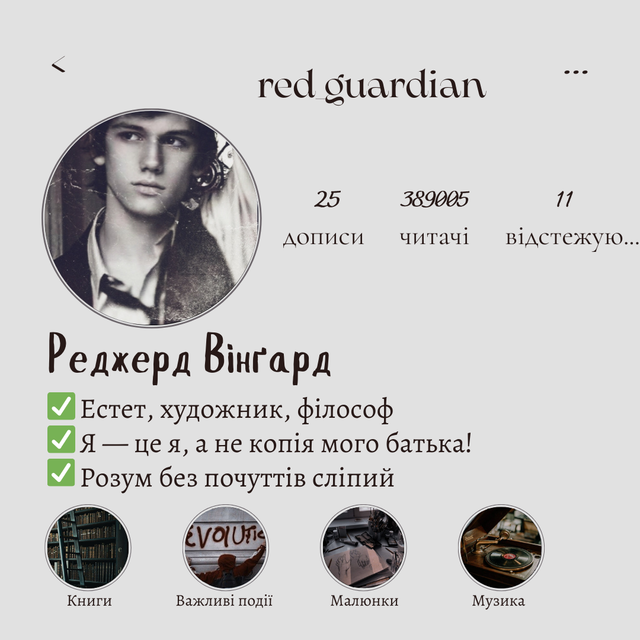 Реджерд Вінґард — один з головних персонажів моєї книги "Колонія. Історія Ріки". Ред дуже загадковий хлопець, його минуле повите мрякою невідомості, проте…
