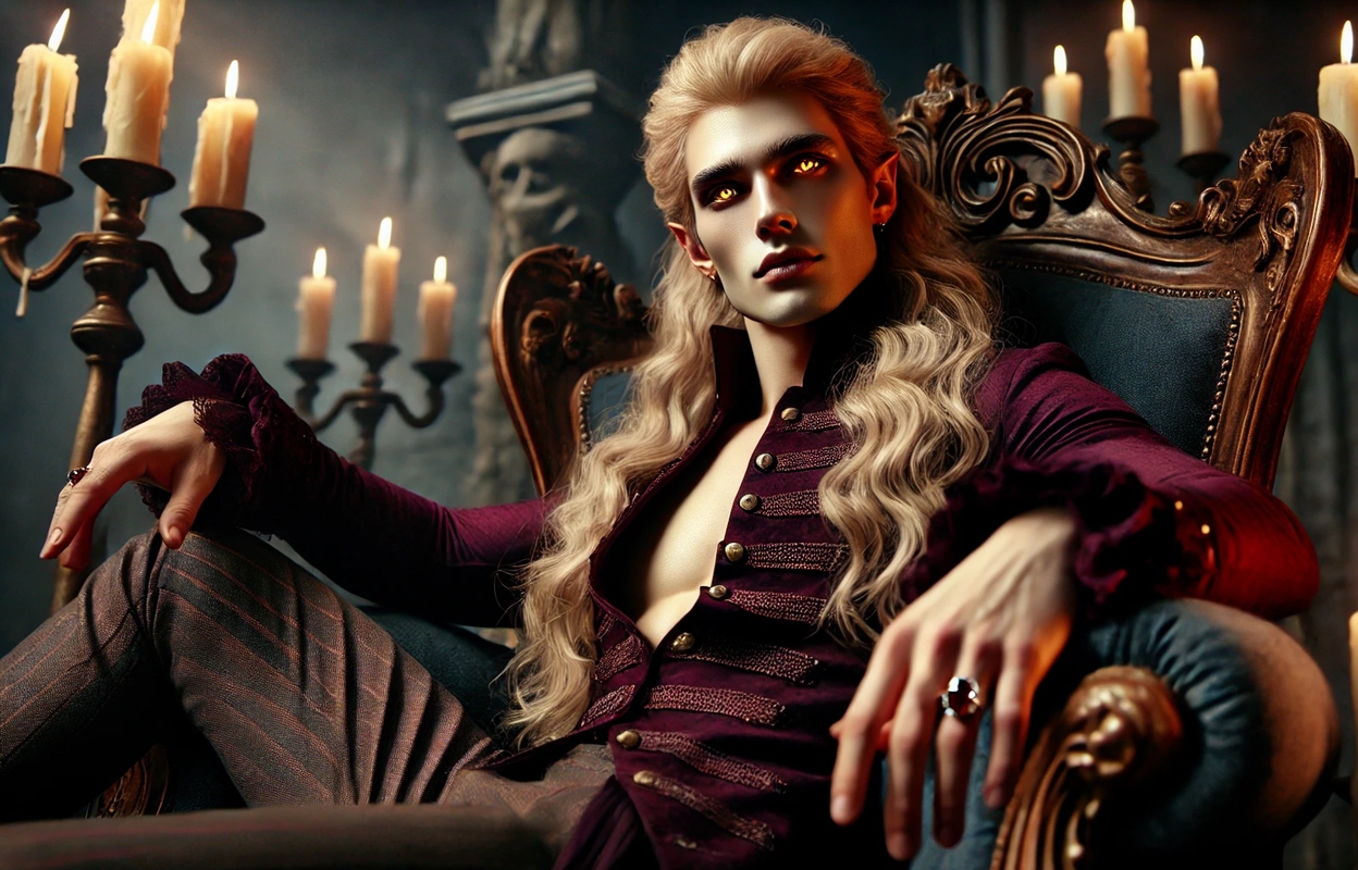 На величному п’єдесталі стояв розкішний трон, а на ньому сидів він. Маючи вигляд, що нехтував правилами бодай елементарної благопристойності світського заходу: максимально розслаблено напівлежачи, в розхристаній оксамитовій сорочці кольору ягідного вина з під якої видніються накачані груди, босі стопи струнких ніг вальяжно закинуті на пуфик, кожну з яких старанно масажують раб та рабиня в напівпрозорому чорному фатиновому одязі з масивними золотими ошийниками, що мерехтять магічним сяйвом.