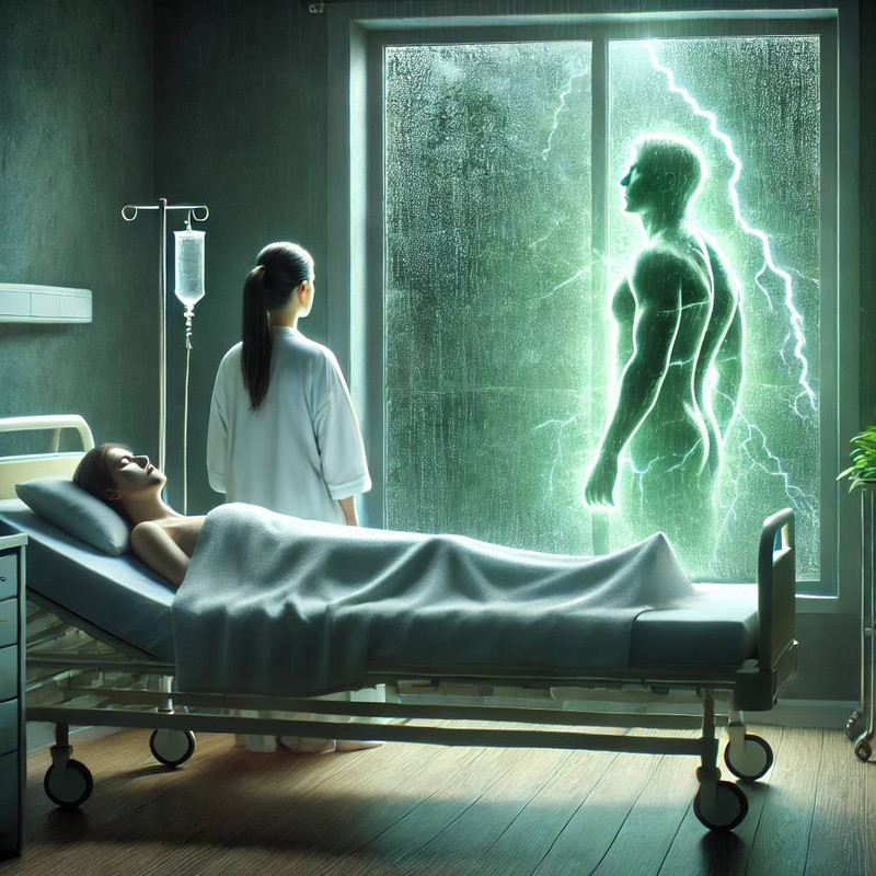Сцена 2. Книга «ТетаАвва. Серце дракона». Кіра з самого початку, не зважаючи на сірий розум, відчула тягу до «знайденого». Його тіло, його запах, його зелене світіння. Госпіталь, палата, гроза за вікном. Лише Кіра та хлопець, якого знайшли за межами цивілізації.