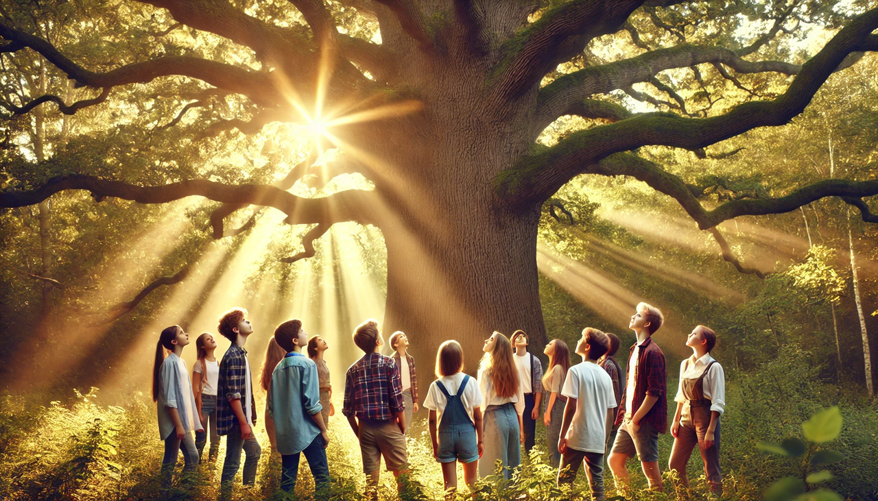 Сцена 3. Книга «Знайдені». Посеред нескінченного лісу стоїть велетень дуб. Могутні гілки розвинуті в сторони. Відчувається не тільки вік гіганта, але й живу силу, що тече всередині нього. Що ховає в собі дуб? Чому шлях до нього був схожий на пекельні перегони?