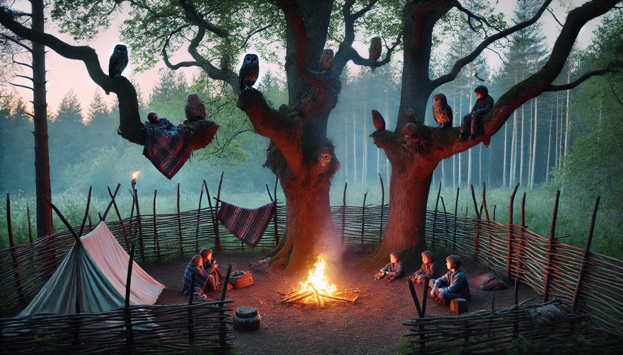 Сцена 2. Книга «Знайдені». Серед нескінченного лісу, на галявині, з двома широкими деревами, та парканом навколо, оселились хлопці та дівчата. Уявіть собі справжній табір серед лісу. Навколо вовки та лисиці, дикі кабани. Хочеш вижити - роби фортецю..