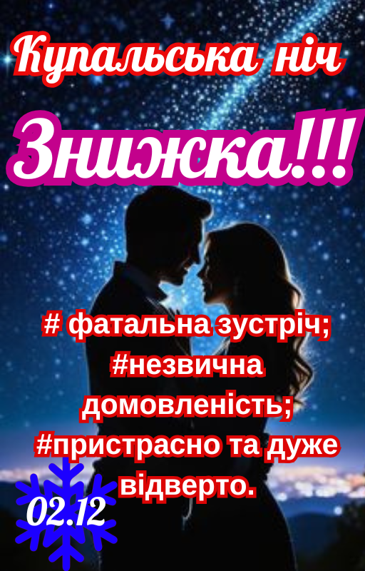 Запрошую, мої любі, до знижки на шалено-відверту історію кохання!!! Роман, "Купальська ніч", — це не про містику, а про шалену пристрасть, бо події тут відбуваються напередодні свята Іванакупала, і закінчується книга у купальську ніч, саме тому така назва.