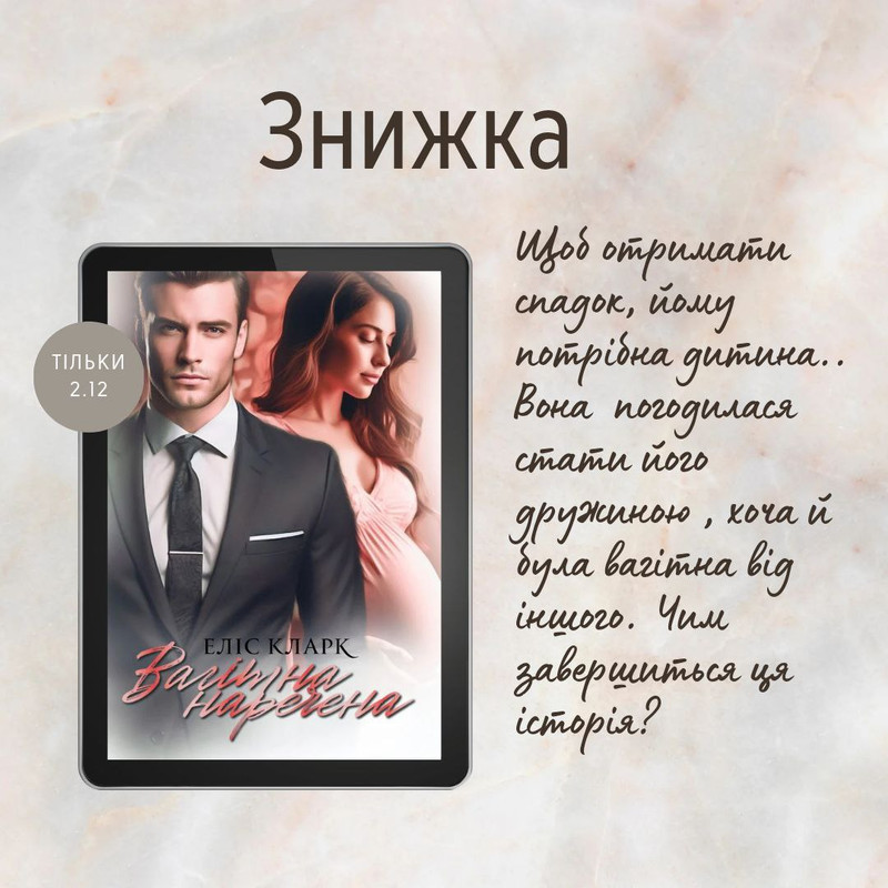 Якщо вам стало цікаво, що поєднує цих двох таких несхожих людей, запрошую до моєї новинки "ВАГІТНА НАРЕЧЕНА"! Сьогодні на цю книгу діє єдина знижка в передплаті, і її можна придбати за мінімальною ціною. Зовсім скоро її буде завершено і вона стане набагато дорожчою! Тож вигідніше придбати її зараз, усього за 39 грн!