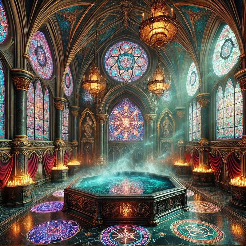 На підлозі з темного мармуру загадково пульсують магічні кола, що обрамляють зону для купання. Різнобарвні вітражні вікна, перемежовані чорними декоративними колонами з золотою ліпниною, переливаються, додаючи простору барвистої величі.