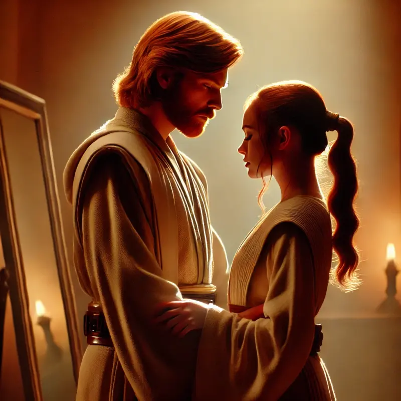 Сцена розгортається перед дзеркалом, де Еніка сушить волосся, а Обі-Ван стоїть позаду неї. Її відображення нагадує йому про все, через що вони пройшли разом, і про силу почуттів, які він не може більше приховувати. Він ніжно обіймає її за талію, його дотик говорить більше, ніж слова. Це момент, коли емоції стають неминучими.