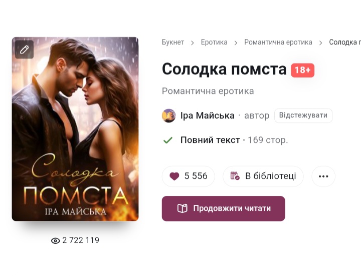 В моїй "Солодкій помсті" вже більше, ніж 5555 вподобайок. Також радію переглядам. Містера Нахабу та головну героїню люблять. Цю історію почала писати приблизно рік тому. Вона моя найперша, з нею я збирала своїх читачів.