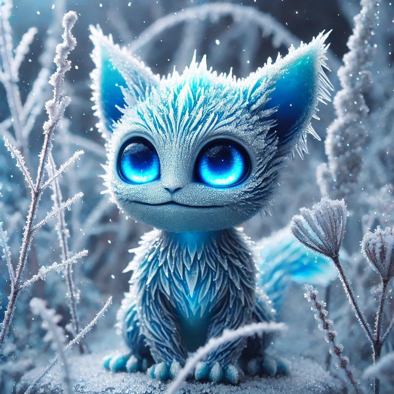 Раптом кущ з ягодами заворушився і просто з-під снігу вистрибнуло щось схоже на кошеня. От тільки поверх шерсті воно було вкрите біло-блакитними кристалами криги й світилося яскраво-блакитним сяйвом. Його великі, майже круглі, очі теж були блакитного кольору. Кошеня стиха нявкнуло і подивилося на мене. Погляд у нього був точнісінько як в того кота з мультика! Я не встояла і, присівши навпочіпки, простягла до котика руку.