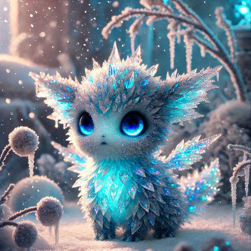 Я вже збиралася підвестися, як з-за ялинки вискочила ще одна істота. Вона виглядала ще більш незвичною ніж крижаний котик. Якщо у котика була шерсть, а кристали були поверх неї, то ця тваринка була повністю вкрита блакитними з бузковим відблиском кристалами, ніби то був їжачок, і теж вся світилася. От тільки тваринка була більш схожа на маленьке, кругленьке цуценя, тільки з товстим хвостом, маленькими крильцями і великими загостреними вухами. Великі сині, з блакитним сяйвом очі тваринки з цікавістю дивилися на мене.