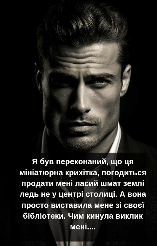 — Ягідко, ти приборкай свій гонор. На місці твоєї макулатурної лавки, має стояти розважальний центр. І він тут стоятиме. — У голосі чоловіка, чується впевненість та погроза.