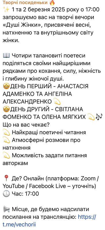 Тоді запрошую вас прийти та послухати мої вірші, та вірші моїх талановитих колег, 01.03.2025 у Zoom.