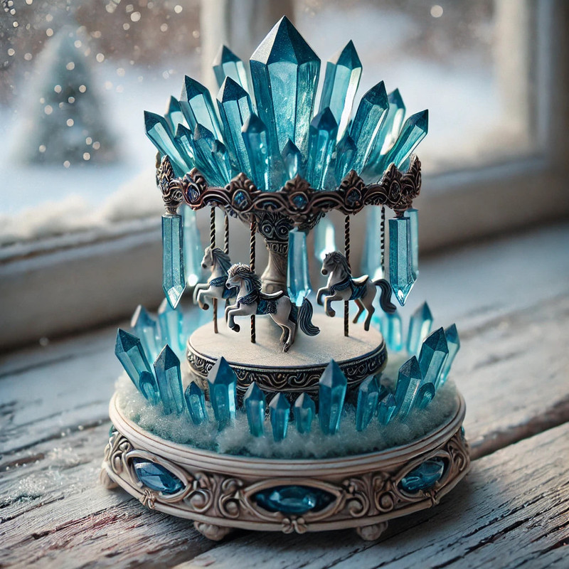 Ерінвальд посунув до мене щось схоже на іграшкову карусель зі світлого металу, інкрустовану прозорими блакитними каменями, в яку було вбудовано багато блакитних кристалів. Ерінвальд торкнувся одного з каменю внизу і карусель з трьома мініатюрними кониками почала крутитися. Ерінвальд торкнувся одного з кристалів зі скриньки полинула пісня — приємний жіночий голос співав про кохання. Карусель повільно крутилася, кристали ледь помітно сяяли, а я зачаровано дивилася на це диво.