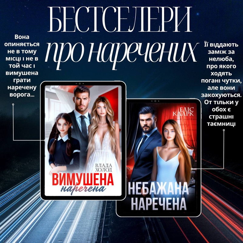 "Вимушена наречена" Влади Холод ( Саші треба наречена, щоб не забрали доньку, Ксю. Катя впізнає в Саші винного в усіх своїх нещастях. Планує втертись в довіру і помститися, тому і погоджується на цю гру, от тільки що сильніше: бажання помсти, чи потяг?)