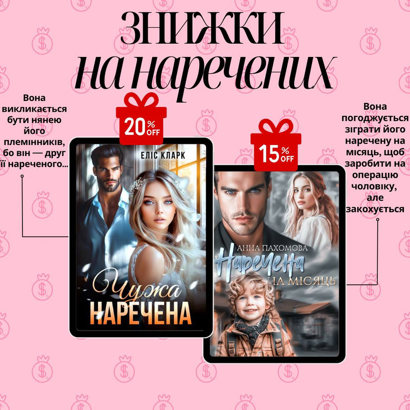 Також сьогодні діють знижки на книгу Еліс Кларк "Чужа наречена" ( Ліка повернулася з-за кордону, де навчалася, і дізналась, що батьки пригледіли для неї майбутнього чоловіка. Ян їй подобається, але що робити, якщо дівчину немов магнітом тягне до кращого друга нареченого?..)