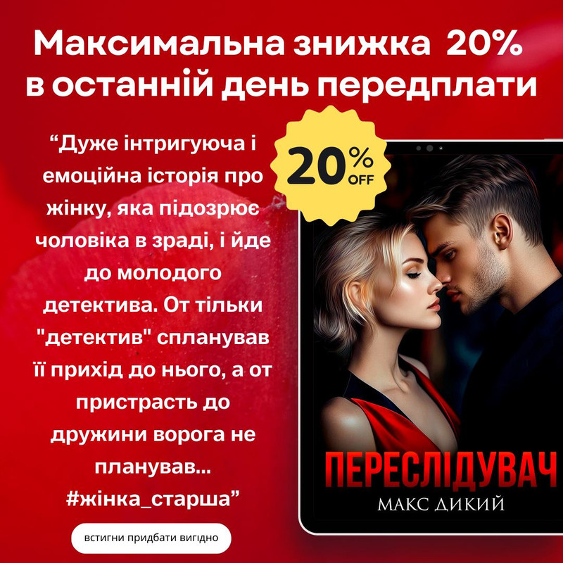 Запрошую вас до неймовірно цікавого романтичного детективу від Макса Дикого! Сьогодні на роман "Переслідувач" діє максимальна знижка!