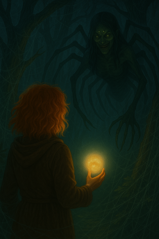 – Хто вам дав право палити мій дім, жалюгідні люди?! – пролунав злісний хрипкий скрипучий голос, як у бабки. Повільно по стовбуру дерева до нас почала спускатися величезна арахна з верхньою частиною тіла жінки але з такою ж кількістю очей і лап як і у звичайних павуків, у неї було довге волосся і дуже гострі і великі зуби, які вона нам показувала в злісній усмішці, забрудненою якоюсь рідиною, чи то кровью, чи ще чимось гидким. Видовище було не з приємних.