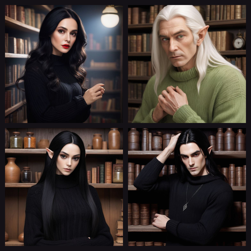 Та ще й прописуєш вік, просиш трохи зморшок. І що виходить? Запит один і той самий, змінюється лише стать персонажа, але чоловіка ШІ зображає старшим, дійсно зі зморшками, а жінку — ні. Втім, Манвейн надто гарна жіночка, щоб їй зморшки домальовувати))) Хай буде так) Все одно мої ельфи молодше за свій вік виглядають. Але ця війна з ШІ мене бісить) Постійно щось не те: то роги ельфам прималює, то руки не там, то одяг не того кольору. І купа часу йде на одну нещасну ілюстрацію.