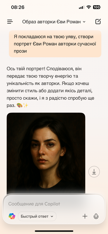 Ідею цього флешмобу піддивилася у Olha Alder та у Марії Залевської. І оскільки дуже люблю у вільний час експериментувати з візуалізаціями ШІ, не втрималась і запитала: як я виглядаю твоїми очами як авторка і власне як книга, яку я пишу.