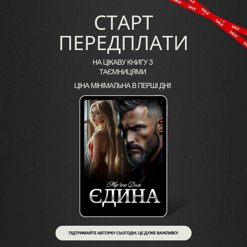 Запрошую вас до своєї книги "Єдина", на яку сьогодні було відкрито передплату! У ній є все, що я люблю - романтика, містика, детектив. Всі герої виявляться не такими, якими здаються на перший погляд, з'являються давні знайомі, кожна відповідь породжує кілька нових запитань... І я сама часом не розумію - чи то я придумала героїв і їхні пригоди, чи то вони живуть десь у паралельному світі і диктують свої правила...