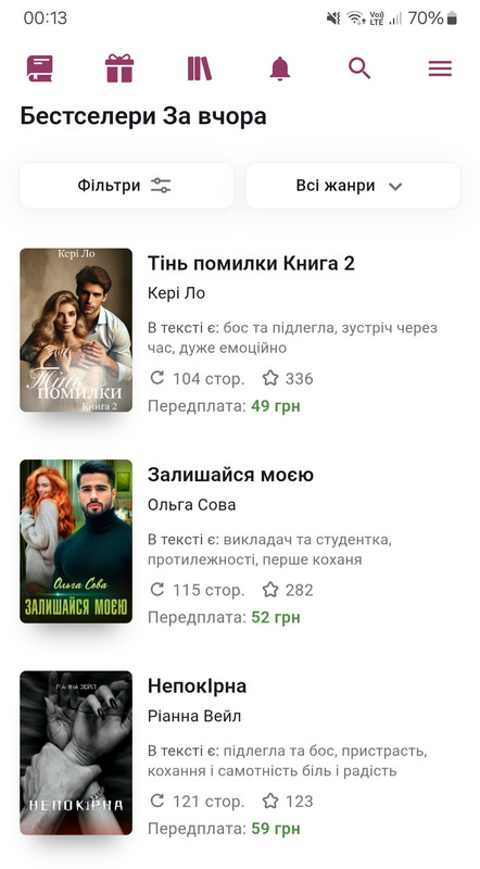 Я в шоці але моя книга Непокірна на 3 місці в бестселерах. Дякую всім хто читає, ви надихаєте писати і надалі. Попереду дуже багато захоплюючих сюжетів.