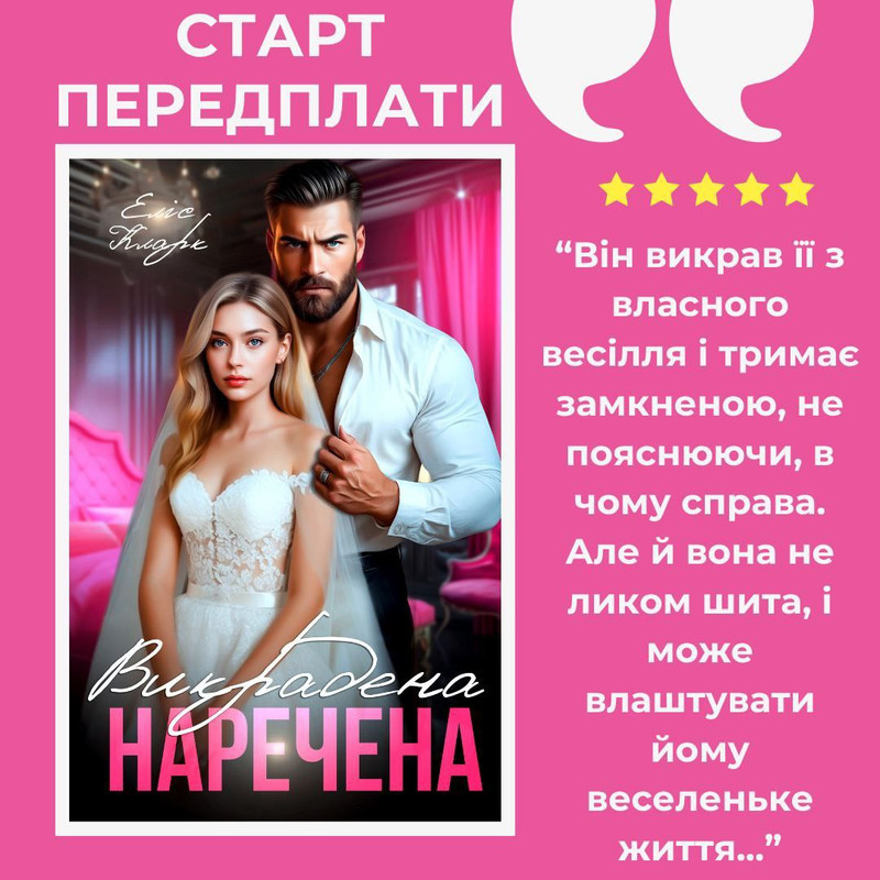 Запрошую до неймовірно емоційної історії - роману про кохання, яке з'явилося не одразу, про прийняття іншої людини і бажання змінитися заради неї, про вміння пробачати і відпускати образи - "Викрадена наречена"! Сьогодні на цю книгу відкрита передплата, але ви можете в найближчі кілька днів скористатися акційною ціною, яка менша, ніж потім буде зі знижкою! Підтримайте мене, будь ласка, в перший день передплати, буду безмежно вам вдячна!