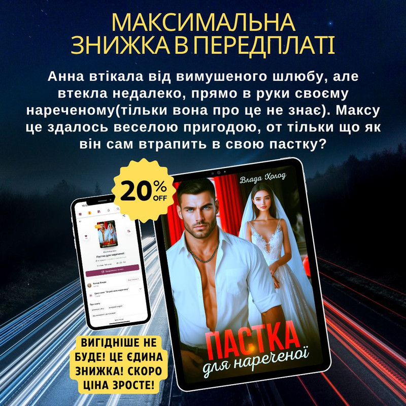 Сьогодні діє єдина знижка в передплаті на захоплюючий роман Влади Холод "Пастка для нареченої"! Тільки до півночі купуйте цю книгу усього за 44 грн!