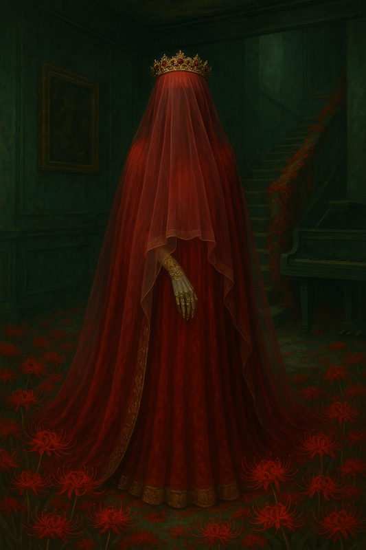Я стояла мов заворожена, але в якийсь момент повз нас хтось промайнув. Наче схоже на жінку, але нічого окрім червоного вбрання і золотої корони в формі вінка, я не розгледіла. Тільки довга червона непроглядна вуаль в підлогу, і незнайомка попрямувала на світло, що линуло з отвору для сходів.