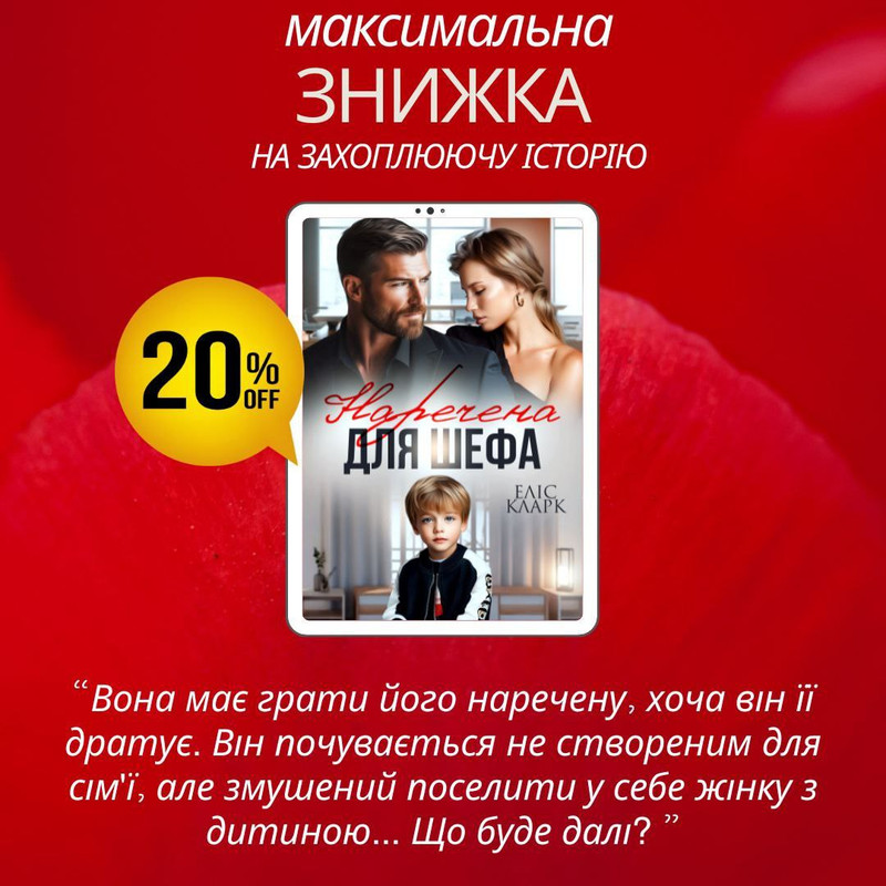 Що буде, коли ці троє - Єгор, Уляна і її маленький син -- зустрінуться в одному місці в один час? Дізнаєтесь, прочитавши роман Еліс Кларк "НАРЕЧЕНА ДЛЯ ШЕФА"!