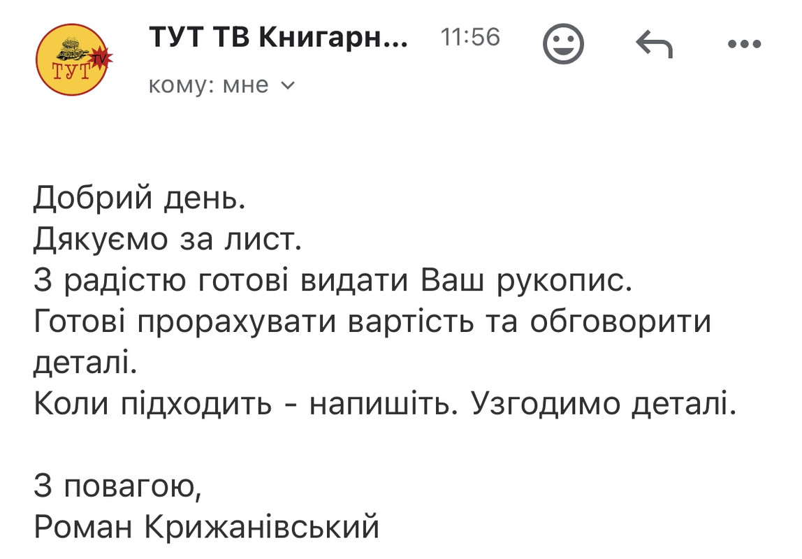 Вже хотіла написати "Вітаю вас!", а тут за свій кошт. Але все одно добре, що відповідають. Бо в більшості випадків від видавництв просто мовчання на рукопис. Проте, як то кажуть: стукайе — і вам відчинять) Успіхів!
