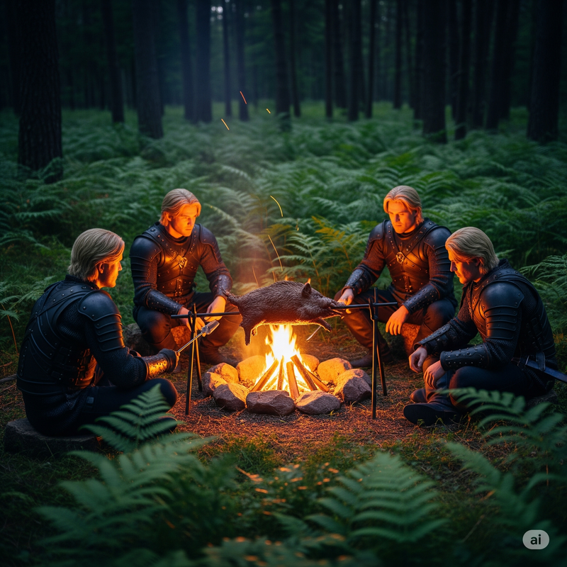 Чотири друга, які прихистили Говіндадаса, коли той шукав де заночувати. Говіндадас до вечора дістався північної сторони Великого Центрального Лісу і йому не довго залишалось до села, але вже вечоріло, тому потрібно було заночувати. Аж раптом, він побачив табір, де і були Свенчич, Володар і два брати Бус і Святогір. Правда вони вийшли всі однакові і дикий вепр, набагато менший, але це вже зовсім інша історія =)
