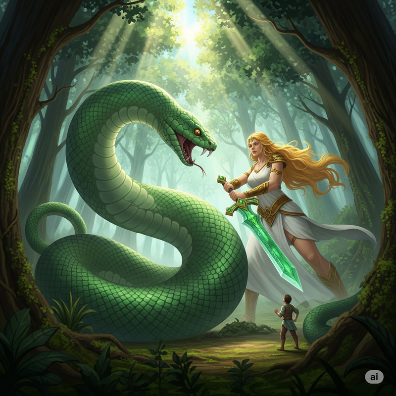 Мутанга — змія з легенд, яка залишилась тільки у Великому Центральному лісі. А та, мила дівчина, то Лада. Тільки вона трошки підросла. Вона тримає смарагдовий меч, яким намагається відбитись від Мутанги.