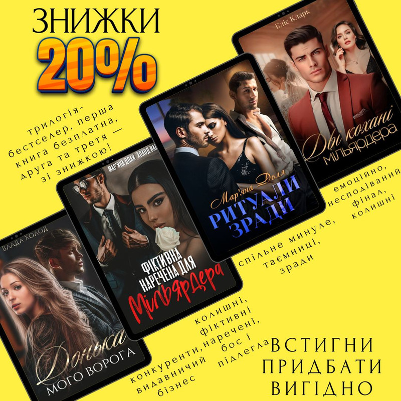 А також нашу з Владою Холод книгу "Фіктивна наречена для мільярдера" Андрій був моїм першим коханням, я вірила, що у нас все серйозно, хай наші стосунки і починались як фіктивні. Але потім він кинув мене прямо перед випуском, сказавши, що для нього це була просто гра. Я намагалась забути його, задля цього не поверталась з Англії, та через хворобу матері була змушена шукати роботу в Україні... Коли я знайшла ідеальну вакансію, виявилось, що саме Андрій мав стати моїм новим босом...