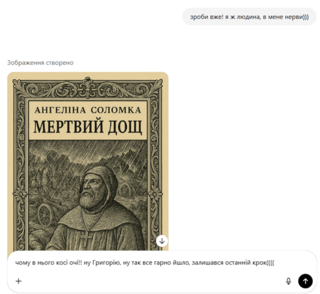Залишилося зовсім трошки – зробити рамку й додати назву й авторку. Він же знає, що зображення більше не треба генерувати, просто використовувати як фон. За годинку впораємось, подумала я.
