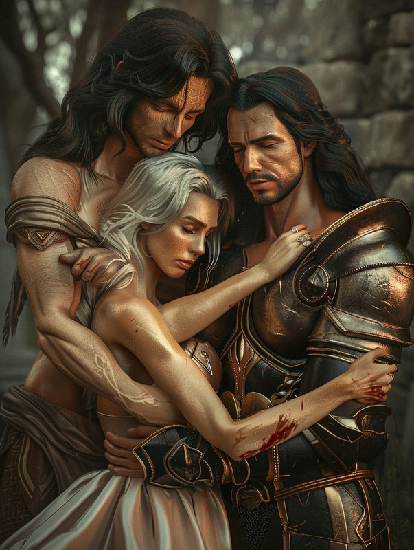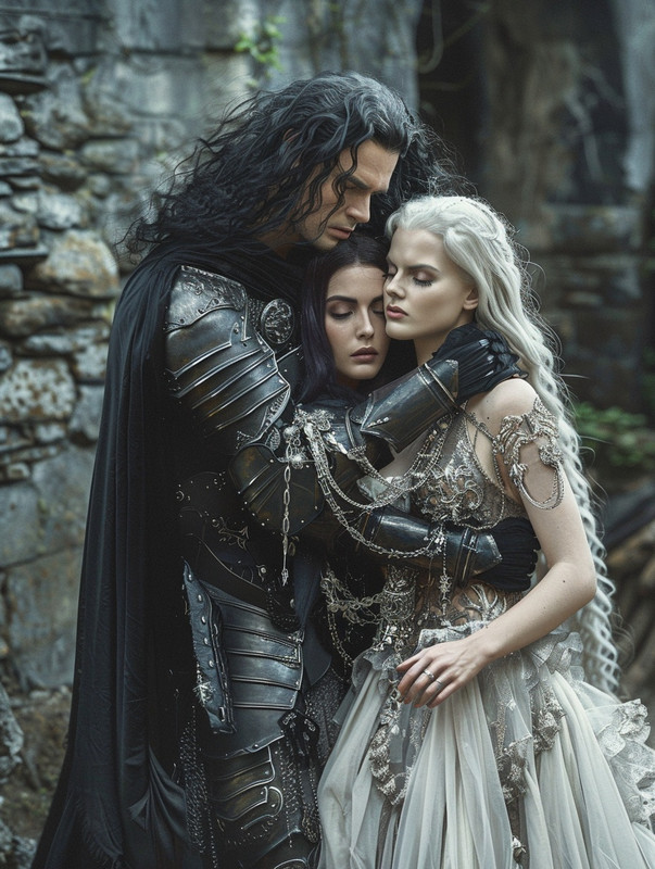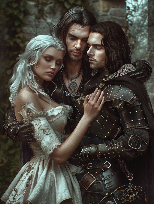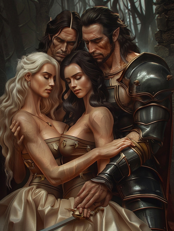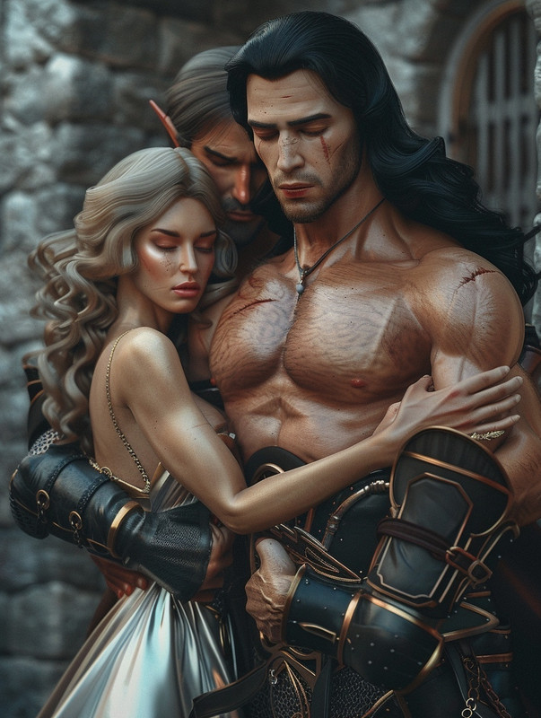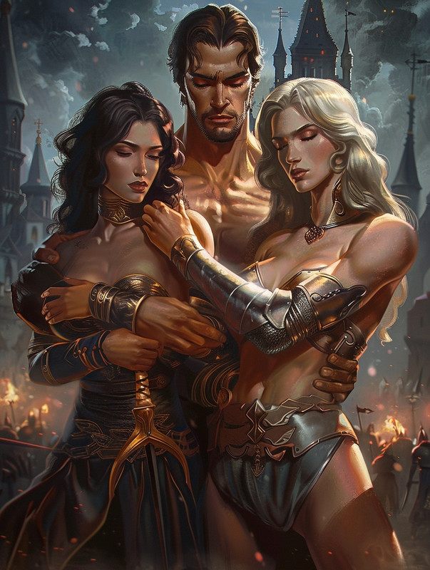 "Один чоловік і дві жінки у середньовічному фентезійному стилі"