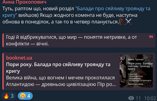 За чашкою кави заходжу я на сторіночку "Балади про сяйливу троянду та кригу", аби подивитися, чи нема випадком нових коментарів, а там... ГОЛЯК. Моє авторське серце мало не розірвалося, адже так хочеться бачити зворотний відгук. Зізнатися, залежна я трохи від цього.) Тому й довелося трохи в письменницькому тг пригрозити...)
