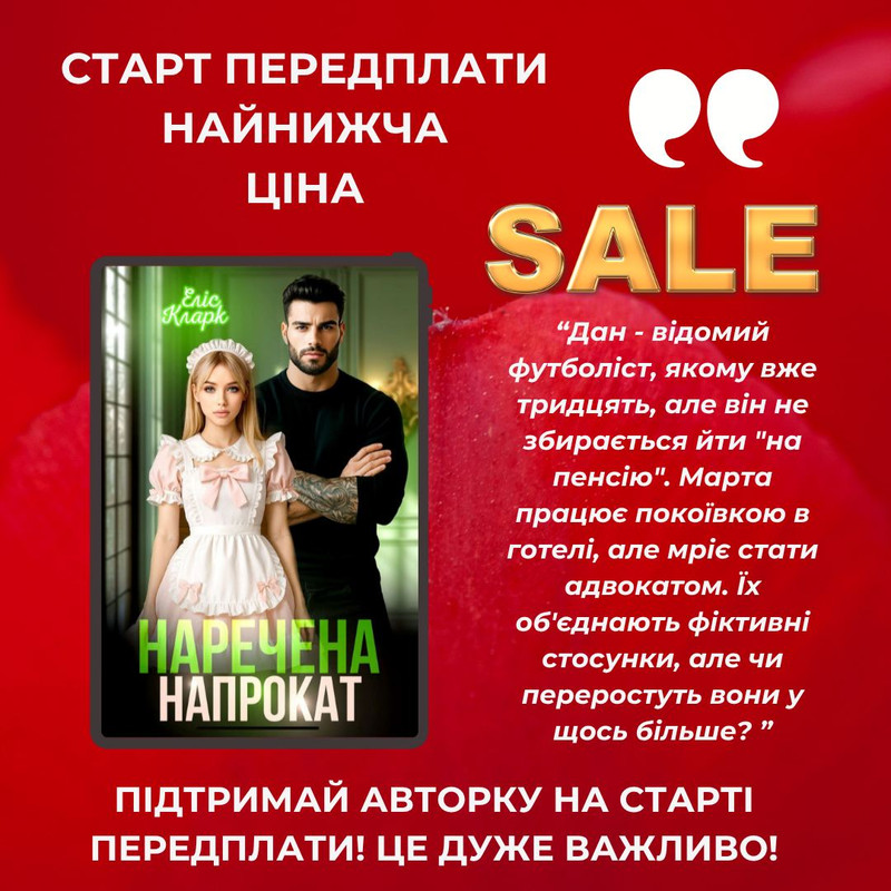 Друзі, запрошую до романтичної новинки від Еліс Кларк "Наречена напрокат"! Сьогодні на неї відкрито передплату. Але зараз ви маєте змогу придбати улюблену історію за найнижчою ціною, а вже за кілька днів книга стане дорожчою!