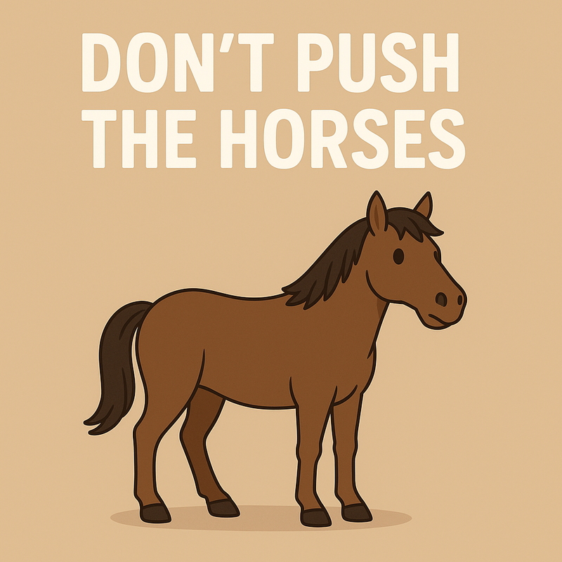 «Don’t push the horses», тобто «Не жени коней» — англому перекладу класичного «hold your horses» . Фраза має комічне коріння: її придумав український стендап‑комік Василь Харизма у шоу «Interesting English» ще у 2024 році, а Усик зробив її міжнародною доктриною стриманості .