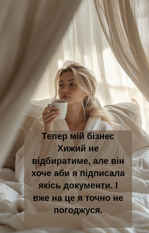 — Добрий самаритянине, ти зараз приколюєшся чи серйозно? — хмурюся й продовжую висловлювати своє невдоволення: — Яке в мене може бути добре? Ти забрав мене у батька за борги, я зараз перебуваю у твоєму домі, ти хочеш, аби я народила тобі дітей, а потім пішла... Ти ставишся до мене, мов до речі, і ще маєш зухвалість питати мене, чи все добре, — перехоплюю подих і додаю: — По-твоєму, це добре?!
