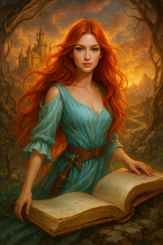 Мені найбільше сподобалася обкладинка з рудою дівчиною (перша запропонована). Вона виглядає загадково, і яскраве волосся на тлі приглушених тонів створює гарний контраст, привертаючи увагу. Замок на фоні та книга в її руках дуже добре передають атмосферу фентезі та зв'язок з історією.