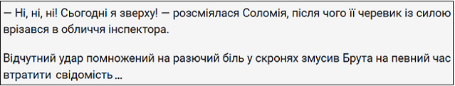 Яка впевнена в собі, зухвала, домінуюча!.. І тут я згадую, як на початку твору вона красувалася в латексних штанах... До чого б це? )) Таємнича таєна...