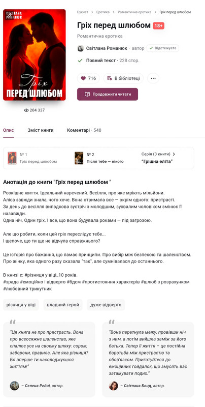 Мій “Гріх перед шлюбом” зараз #1 в еротиці і романтичній еротиці, та ще й #2 у СЛР!