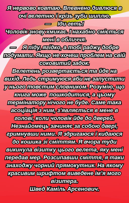 Привітики, мої дорогі читачі! ❤️☺️ Сьогодні я до вас із маленьким спойлером до розділу, що вийде о 00:00. І, ого-го, у ньому починаються ревнощі Захара Влащенка… Він нахилився ще ближче, губи майже торкнулися